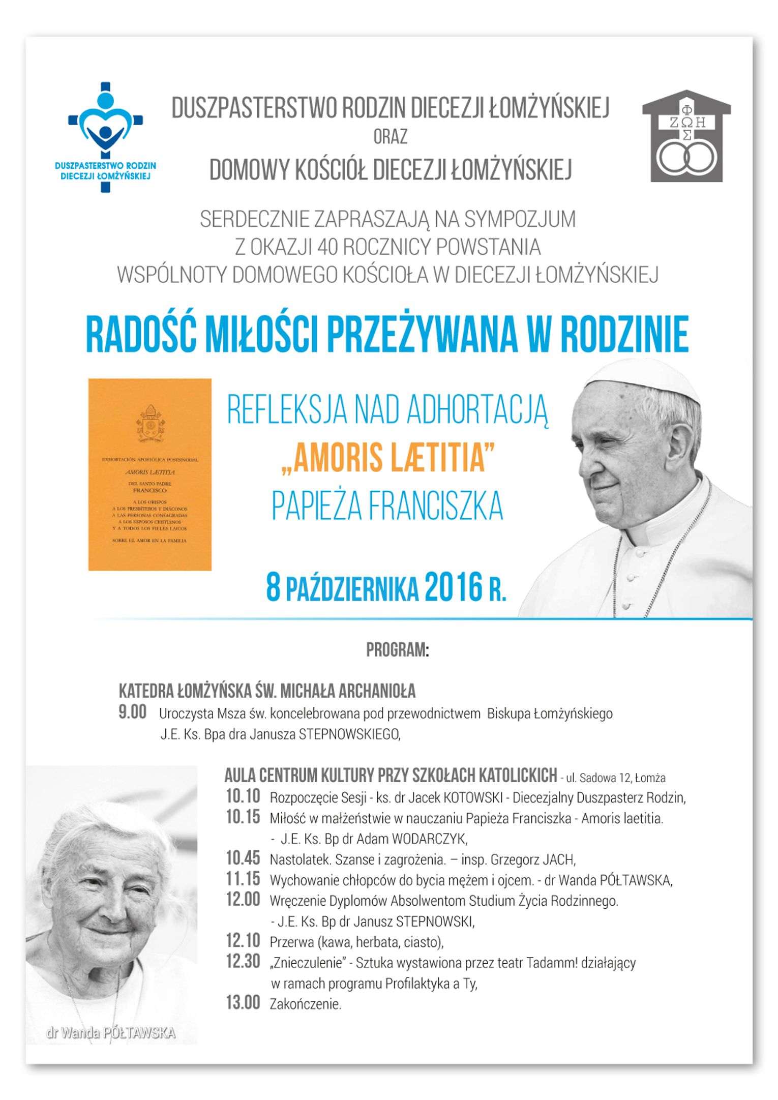 Duszpasterstwo Rodzin Diecezji Łomżyńskiej oraz Domowy Kościół Diecezji Łomżyńskiej zapraszają na sympozjum z okazji 40 rocznicy powstania wspólnoty domowego kościoła w diecezji łomżyńskiej.