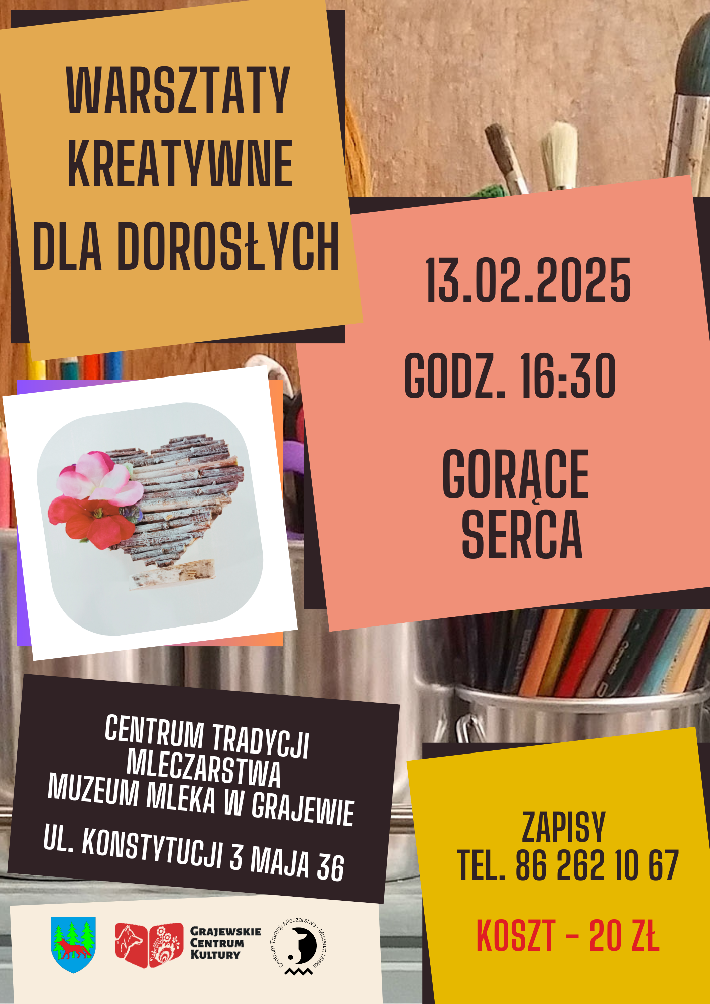 Grajewskie Centrum Kultury zaprasza na kreatywne warsztaty dla dorosłych pt. "Gorące Serca", które odbędą się 13 lutego 2025 roku o godzinie 16.30 w Centrum Tradycji Mleczarstwa - Muzeum Mleka w Grajwie, przy ulicy Konstytucji 3 Maja 36. Cena za wstęp wynosi 20 zł. Obowiązują zapisy pod nr tel.: 86 262 10 67.