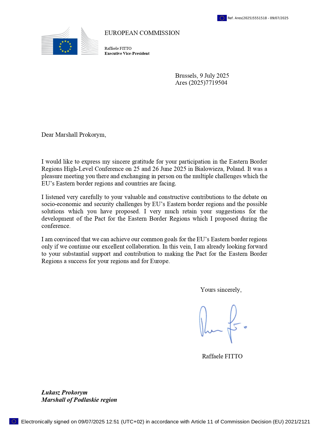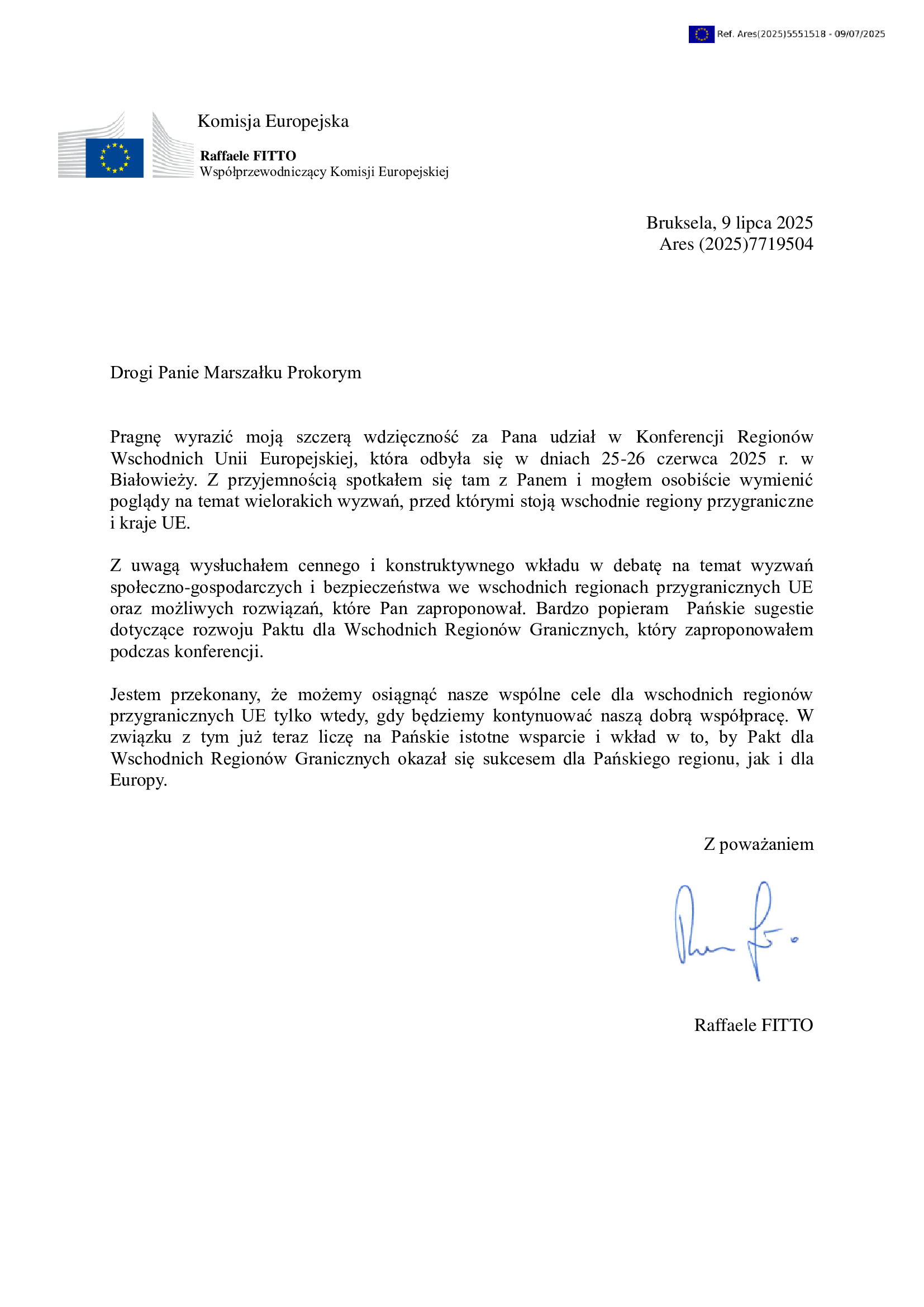 „Pragnę wyrazić moją szczerą wdzięczność za Pana udział w Konferencji Regionów Wschodnich Unii Europejskiej, która odbyła się w dniach 25-26 czerwca 2025 r. w Białowieży. Z przyjemnością spotkałem się tam z Panem i mogłem osobiście wymienić poglądy na temat wielorakich wyzwań, przed którymi stoją wschodnie regiony przygraniczne i kraje UE.