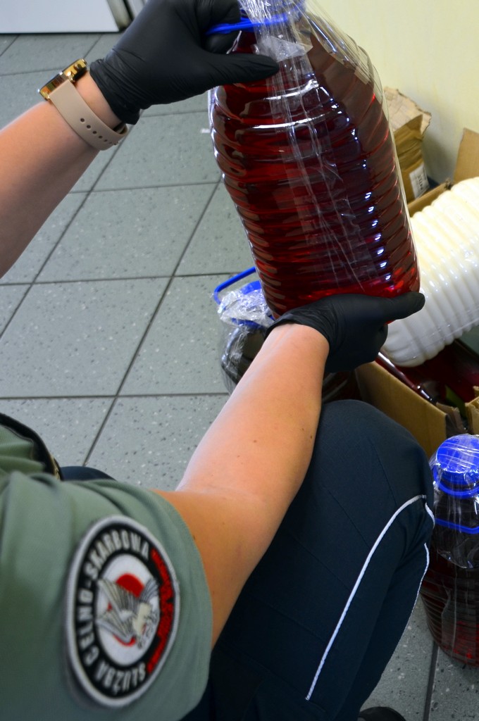 W trakcie sprawdzania pojazdu funkcjonariusze odkryli w bagażniku kilkadziesiąt butelek z alkoholem. Łącznie zabezpieczono 127,5 litra trunku bez polskich znaków akcyzy. Jak ustalili mundurowi, przewożony towar stanowił nielegalny alkohol – najprawdopodobniej domowej produkcji.