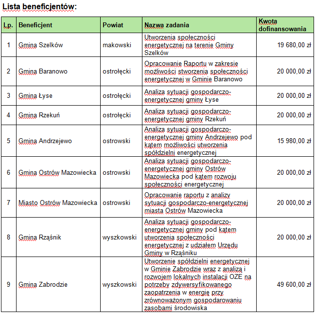 W ramach „Mazowieckiego Instrumentu Wspierania Społeczności Energetycznych” do gmin trafią środki przeznaczone na tworzenie i rozwój spółdzielni energetycznych i klastrów energii. Łącznie to 5 mln zł na realizację 48 zadań. Do regionu ostrołęckiego trafi 205,2 tys. zł na wykonanie 9 projektów.
