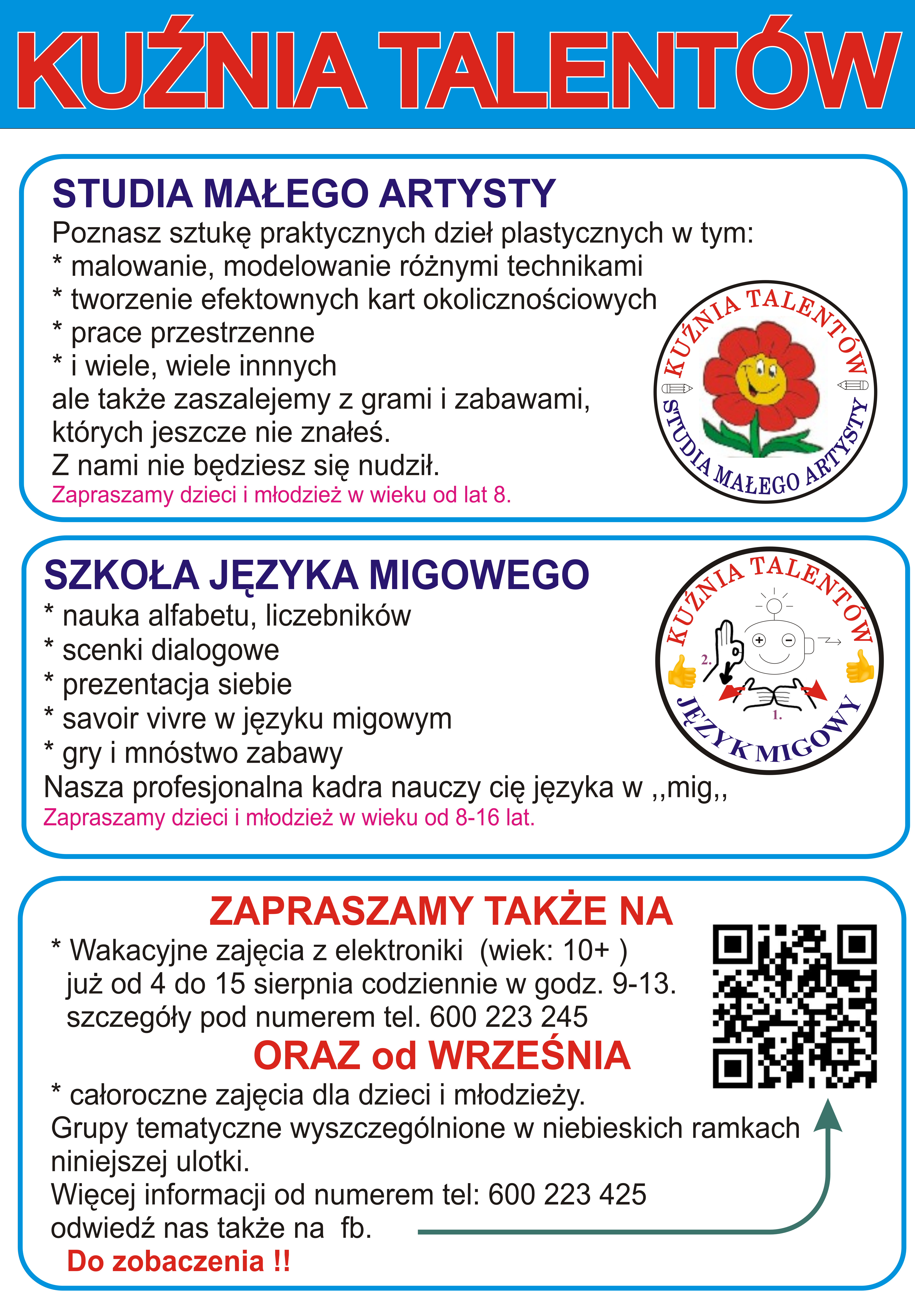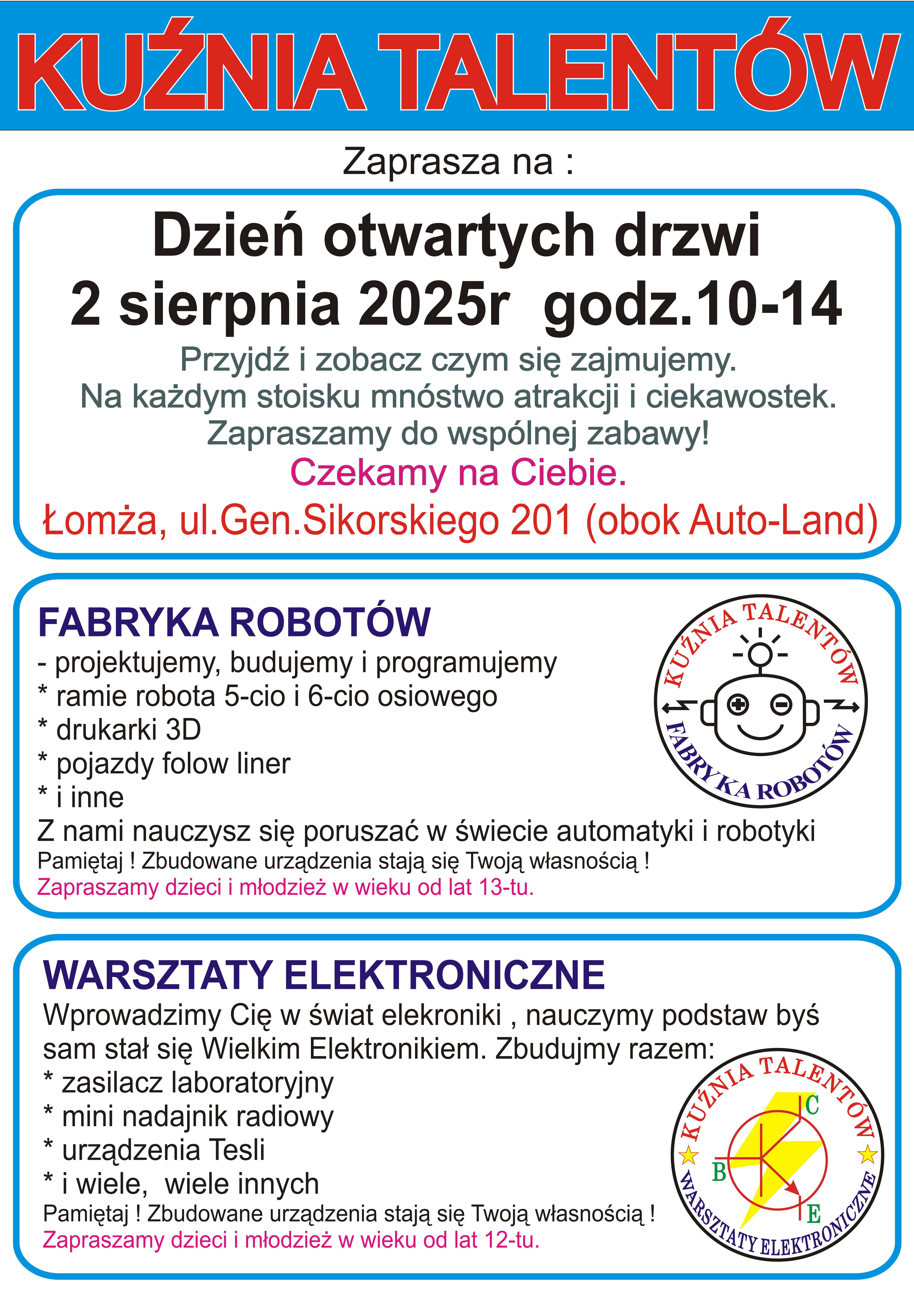 Już 2 sierpnia 2025 roku w godzinach 10:00–14:00 przy ul. Gen. Sikorskiego 201 w Łomży odbędzie się Dzień Otwarty Kuźni Talentów. To doskonała okazja, by zobaczyć, jak rozwija się kreatywność dzieci i młodzieży poprzez warsztaty z robotyki, elektroniki, języka migowego i plastyki. Czekają liczne atrakcje i interaktywne stoiska!