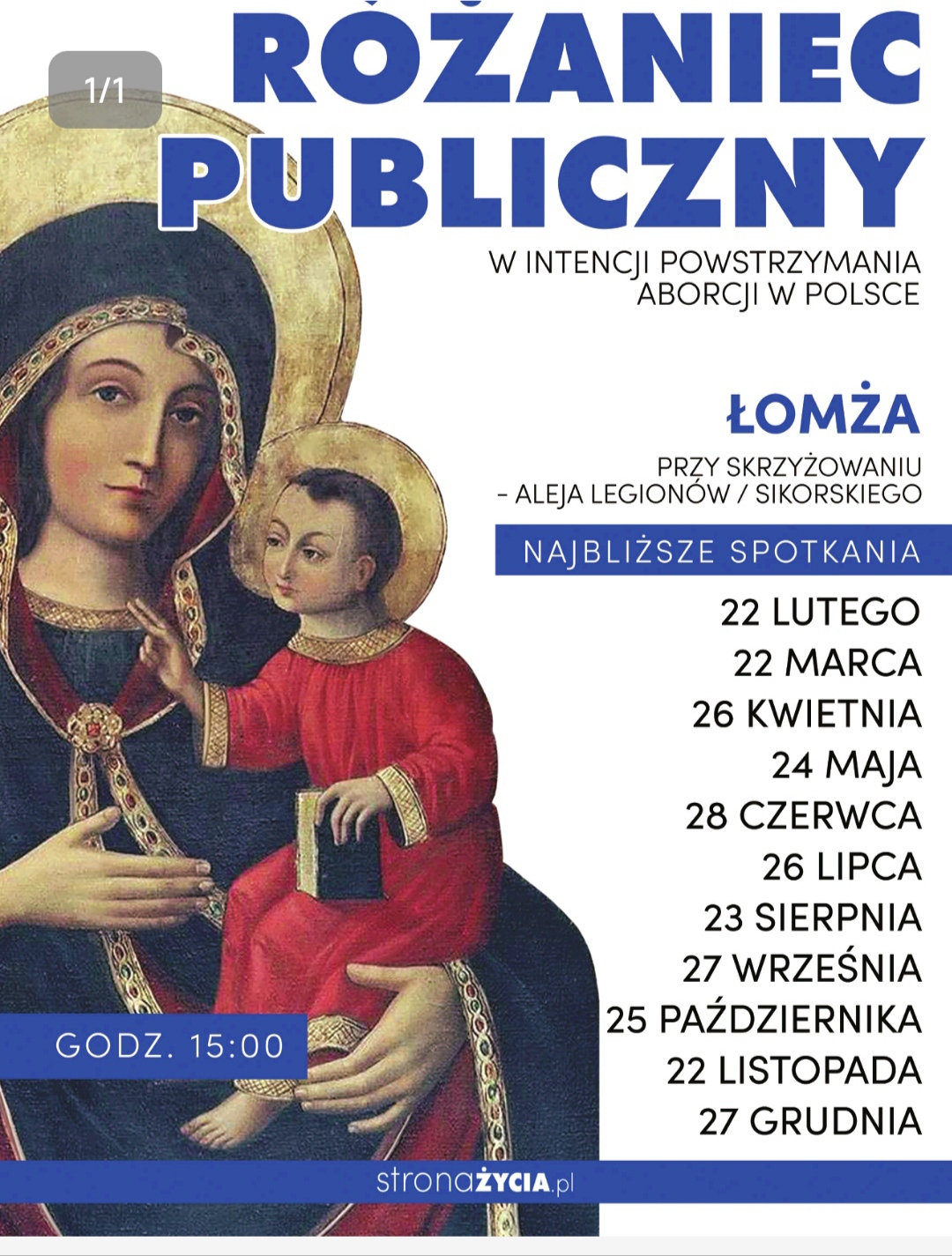 W sobotę, 23 sierpnia, o godzinie 15:00 w Łomży przy skrzyżowaniu Alei Legionów i ul. Sikorskiego odbędzie się Różaniec Publiczny w intencji powstrzymania aborcji w Polsce. Organizatorzy podkreślają, że pikieta jest oficjalnie zgłoszona i przebiegać będzie pod asekuracją policji. Te cykliczne spotkania modlitewne odbywają się w każdą czwartą sobotę miesiąca i gromadzą wiernych, którzy chcą publicznie wyrazić swoje stanowisko oraz zawierzyć tę sprawę modlitwie. Kolejne wydarzenia zaplanowano m.in. na 27 września, 25 października i 22 listopada.