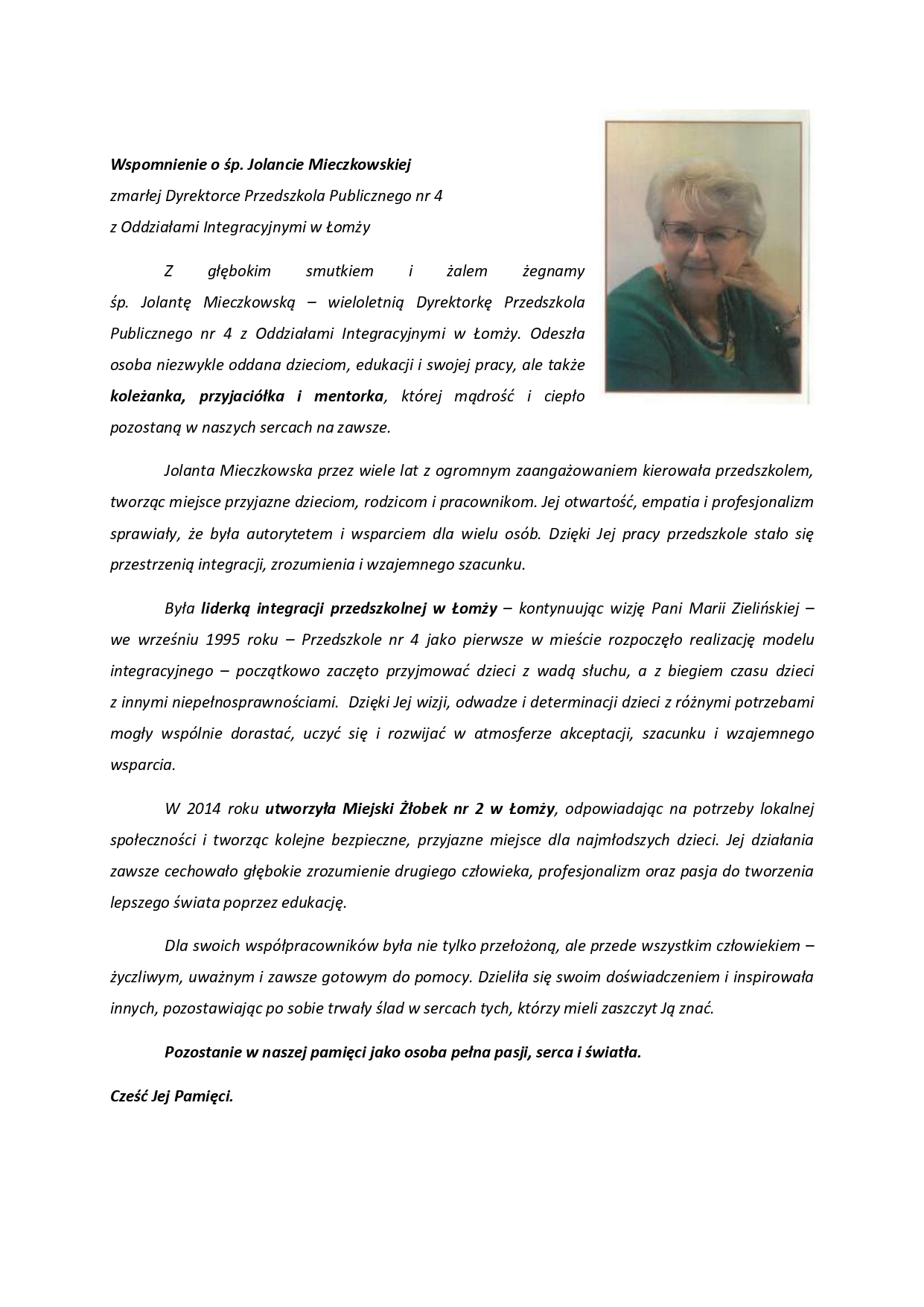 Z głębokim żalem przyjęto wiadomość o śmierci Jolanty Mieczkowskiej, wieloletniej dyrektorki Przedszkola Publicznego nr 4 z Oddziałami Integracyjnymi w Łomży. Była osobą oddaną dzieciom i edukacji, która na zawsze pozostanie w pamięci wychowanków, współpracowników i całej społeczności miasta.