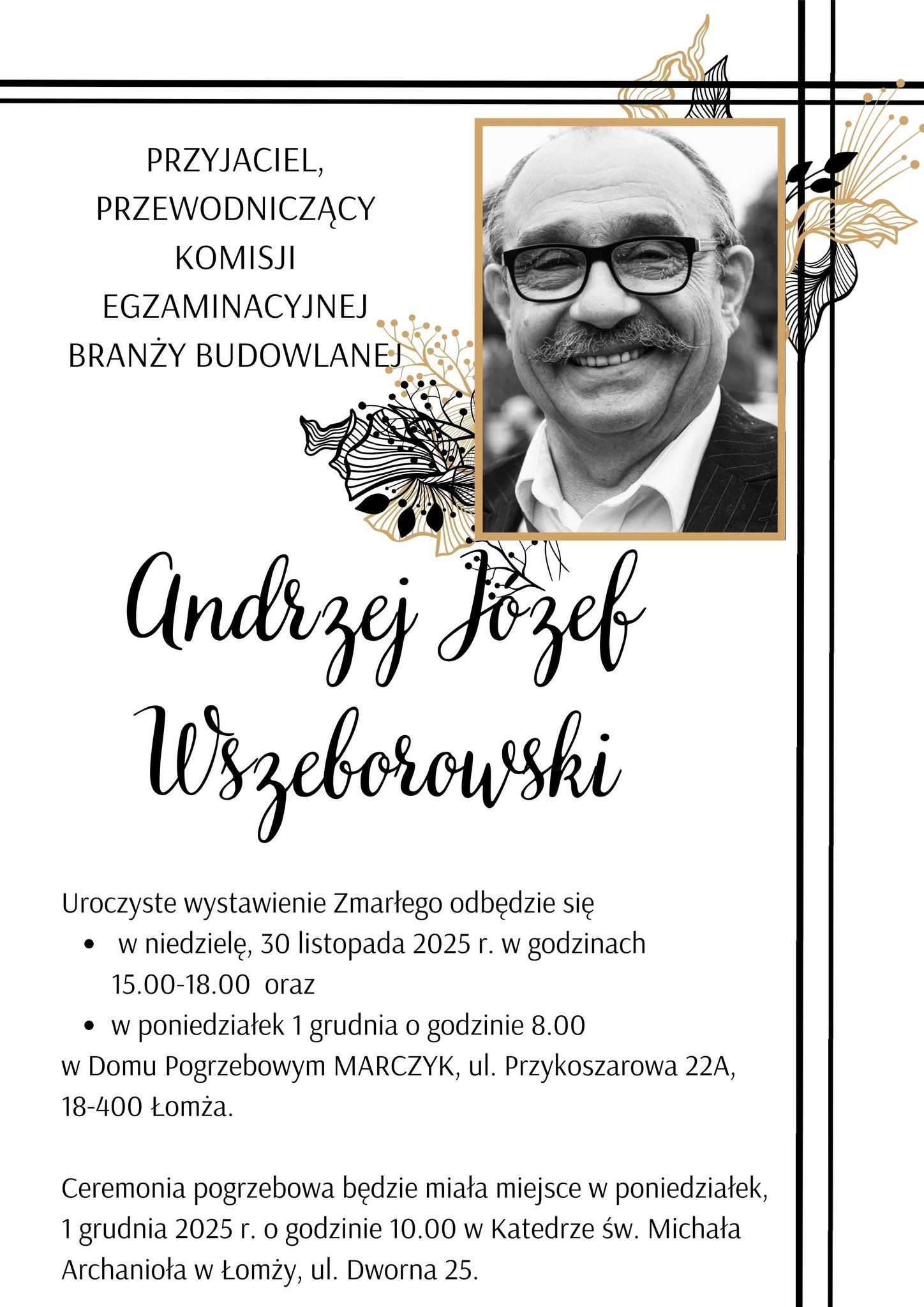 „Z głębokim smutkiem i żalem informujemy, że 28 listopada 2025 r. zmarł Andrzej Józef Wszeborowski – przyjaciel oraz przewodniczący komisji egzaminacyjnej w branży budowlanej.
