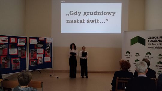 Wprowadzeniem w atmosferę dramatycznych wydarzeń sprzed ponad czterech dekad był utwór Przemysława Gintrowskiego „A my nie chcemy…”. Następnie uczennice klasy 4PP – Zosia Cwalina i Natalia Mierzejewska – poprowadziły program historyczno‑muzyczny, w którym przedstawiły okoliczności wprowadzenia stanu wojennego, skalę represji oraz formy oporu podejmowane przez opozycję i społeczeństwo. Prezentacja multimedialna, wzbogacona o utwory Jacka Kaczmarskiego „Obława” oraz Przemysława Gintrowskiego „Modlitwa o wschodzie słońca”, dopełniała przekazu, ukazując tragizm tamtych dni.