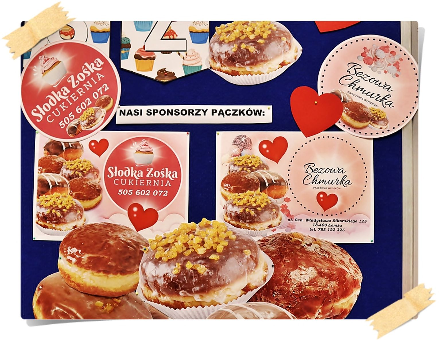 Wspaniałymi darczyńcami okazały się renomowane łomżyńskie cukiernie: CUKIERNIA Słodka Zośka w Łomży oraz Bezowa Chmurka – PRACOWNIA WYPIEKÓW.