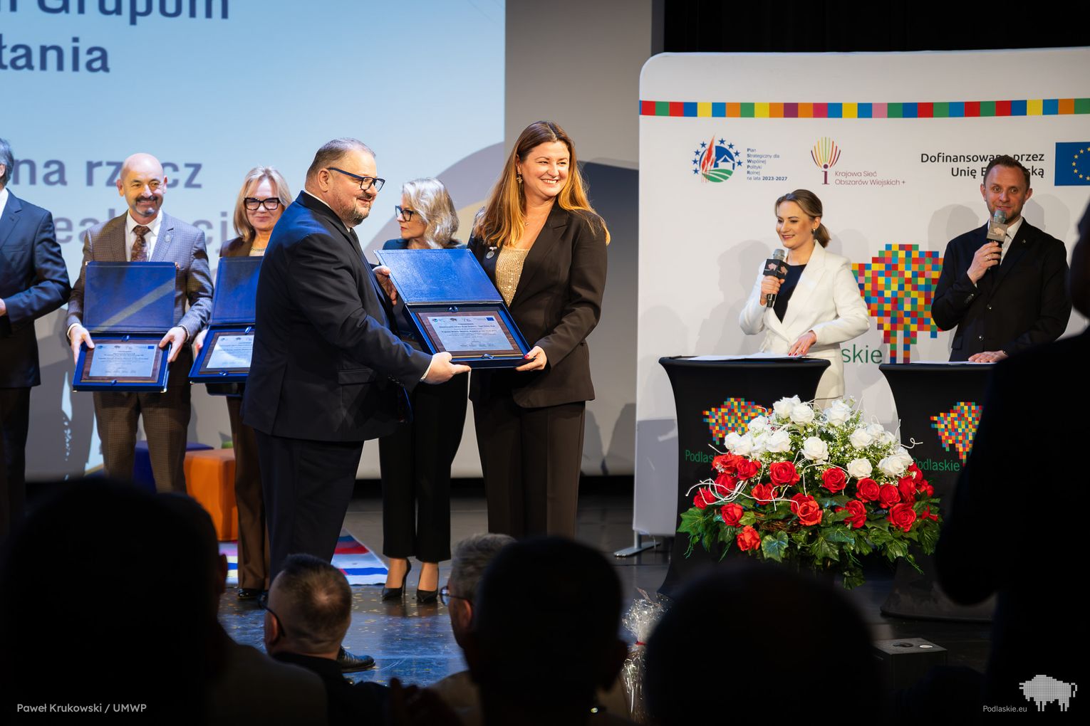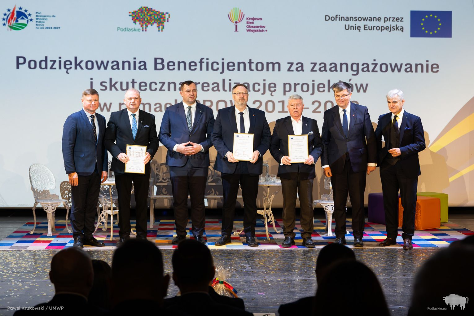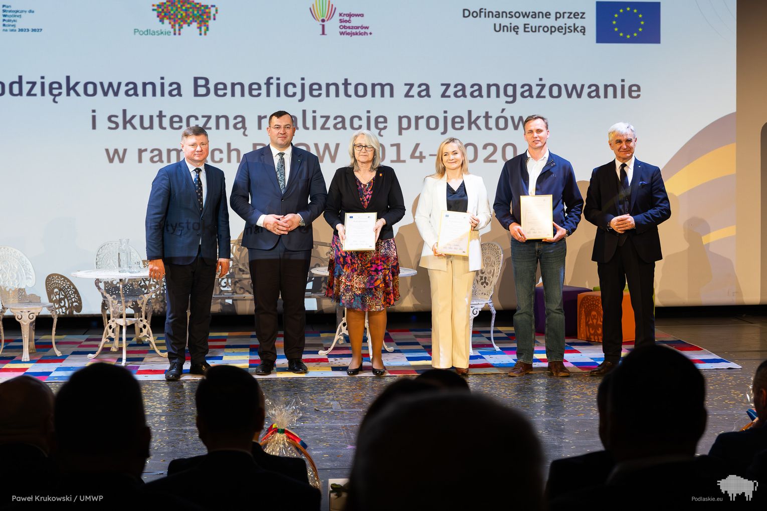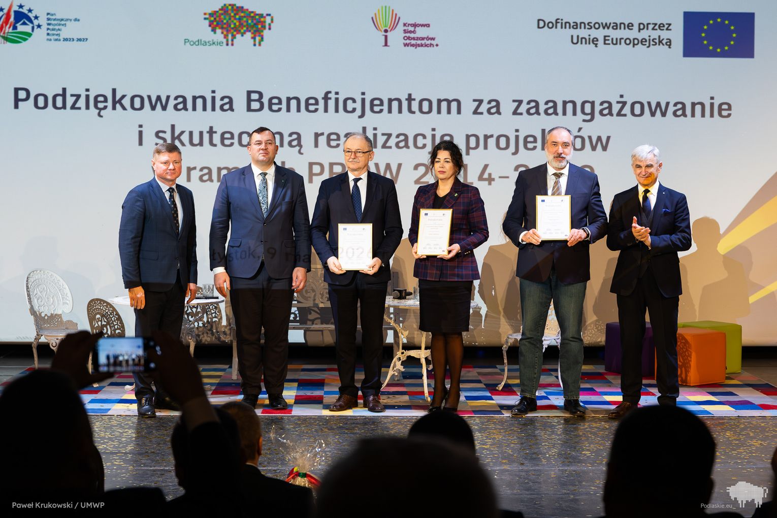 Jednym z kluczowych momentów wydarzenia było uhonorowanie osób zaangażowanych we wdrażanie Programu Rozwoju Obszarów Wiejskich na lata 2014–2020 w województwie podlaskim. Podziękowania skierowano do wszystkich, którzy przyczynili się do realizacji programu, w tym m.in. ministra Stefana Krajewskiego. Podczas uroczystości wręczono także podziękowania beneficjentom programu PROW 2014–2020 – łącznie przyznano 85 wyróżnień. Listy gratulacyjne otrzymali również pracownicy Departamentu Rolnictwa i Rozwoju Obszarów Wiejskich oraz Biura Prawnego Urzędu Marszałkowskiego Województwa Podlaskiego. Był to moment docenienia osób odpowiedzialnych na co dzień za obsługę wniosków, kontakt z beneficjentami oraz zapewnienie wsparcia prawnego – wyróżniono w ten sposób 25 osób. Dodatkowo podczas wydarzenia wręczono 16 odznaczeń Zasłużony dla Rolnictwa osobom szczególnie zaangażowanym w rozwój rolnictwa i obszarów wiejskich. Doceniono także Lokalne Grupy Działania, którym przyznano pamiątkowe grawertony za skuteczne wdrażanie inicjatyw w ramach podejścia LEADER. Pełna lista wyróżnionych znajduje się w załączniku pod artykułem.