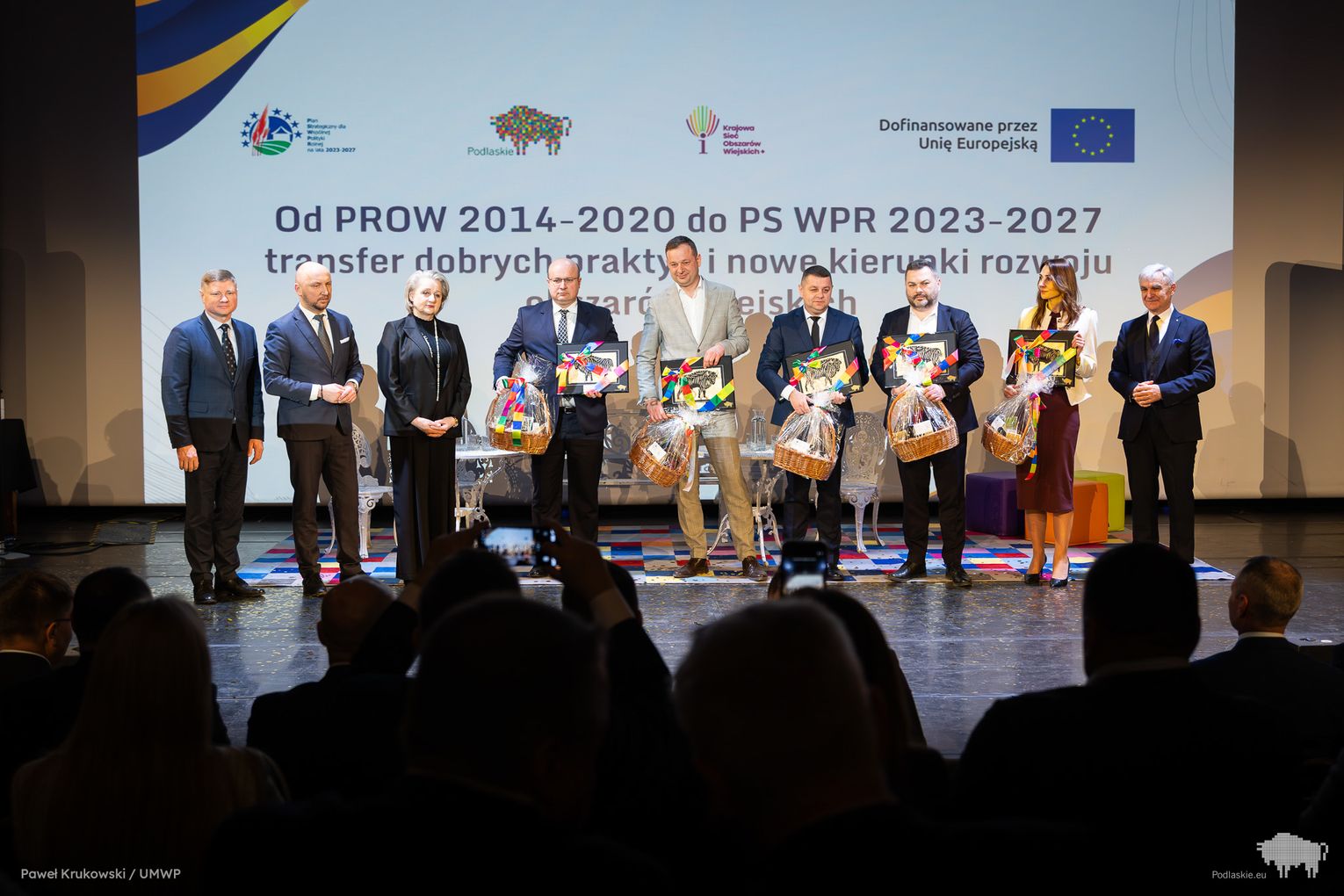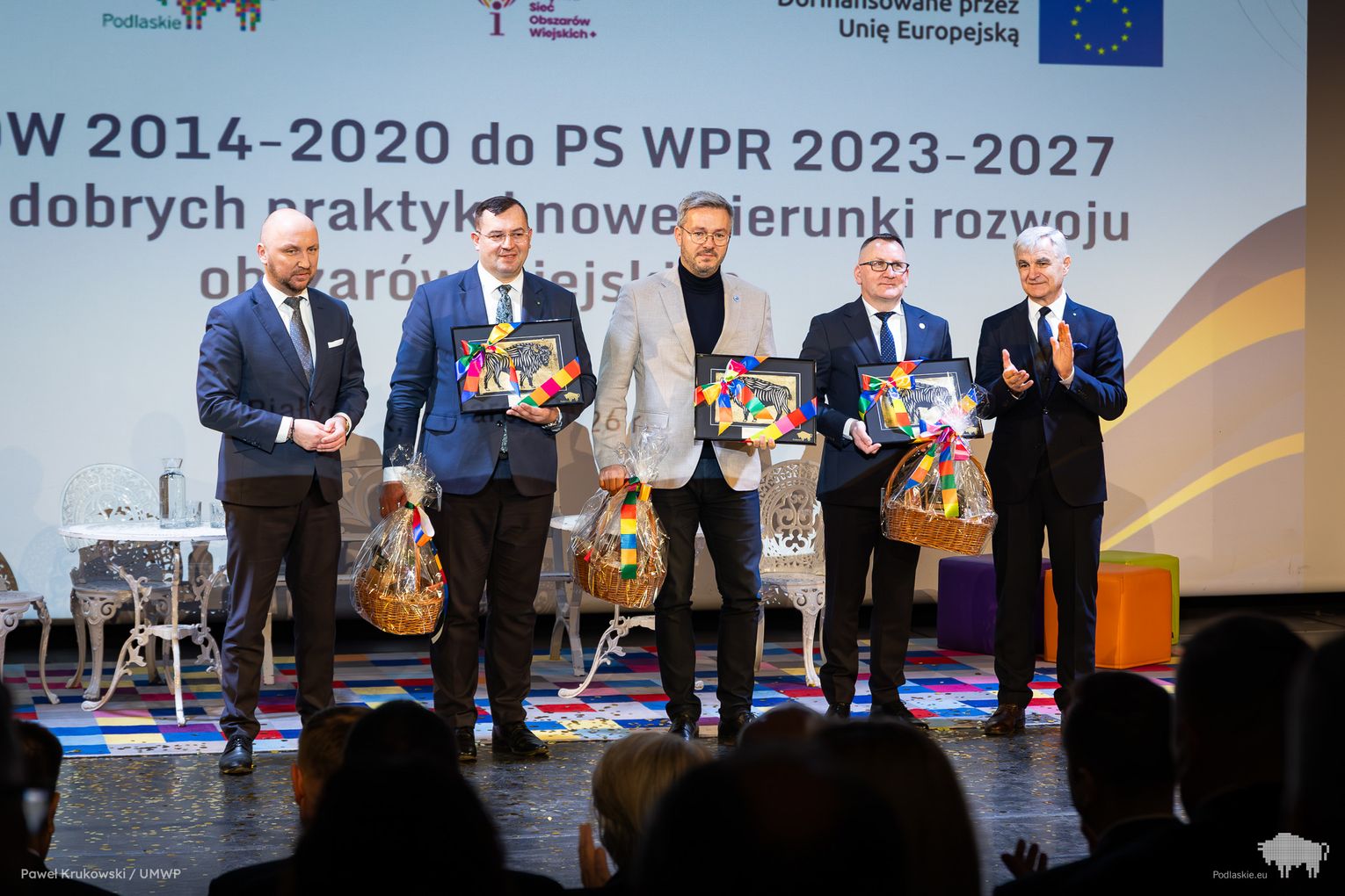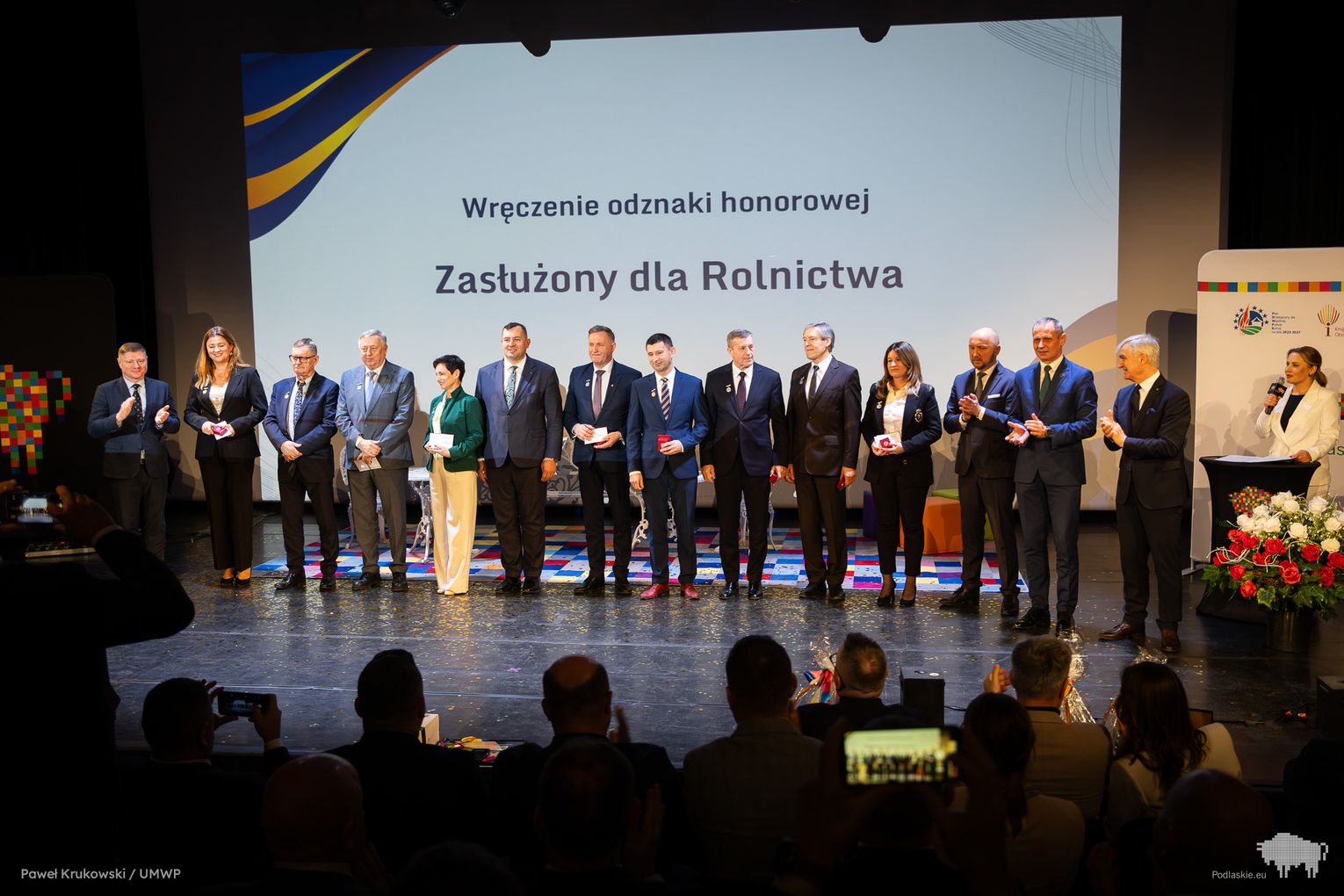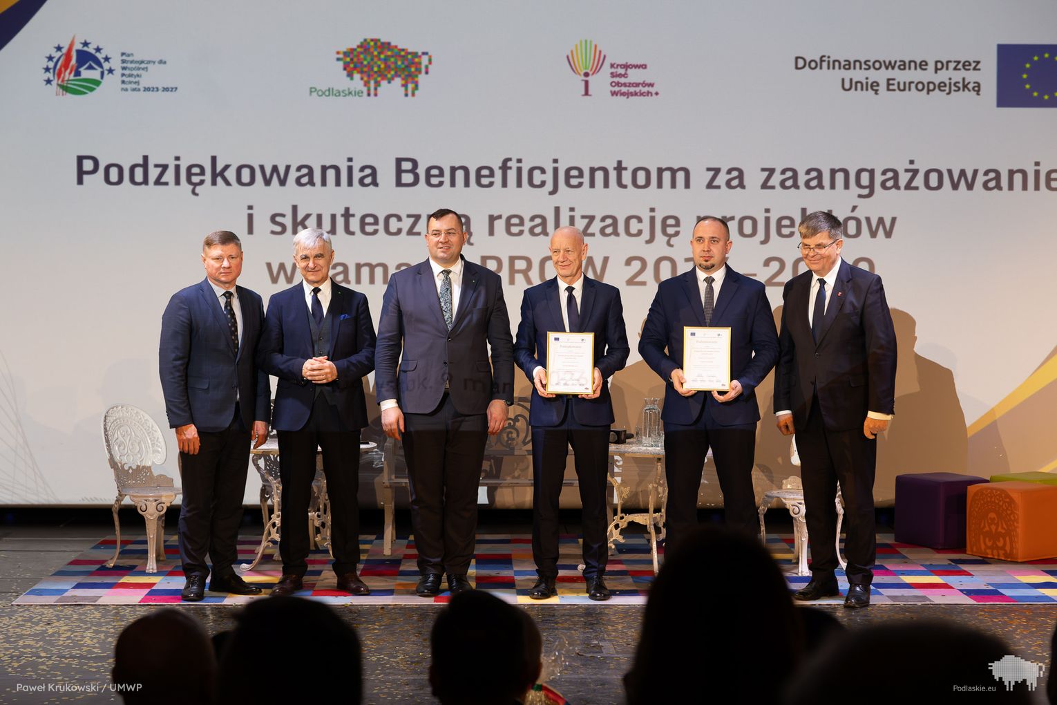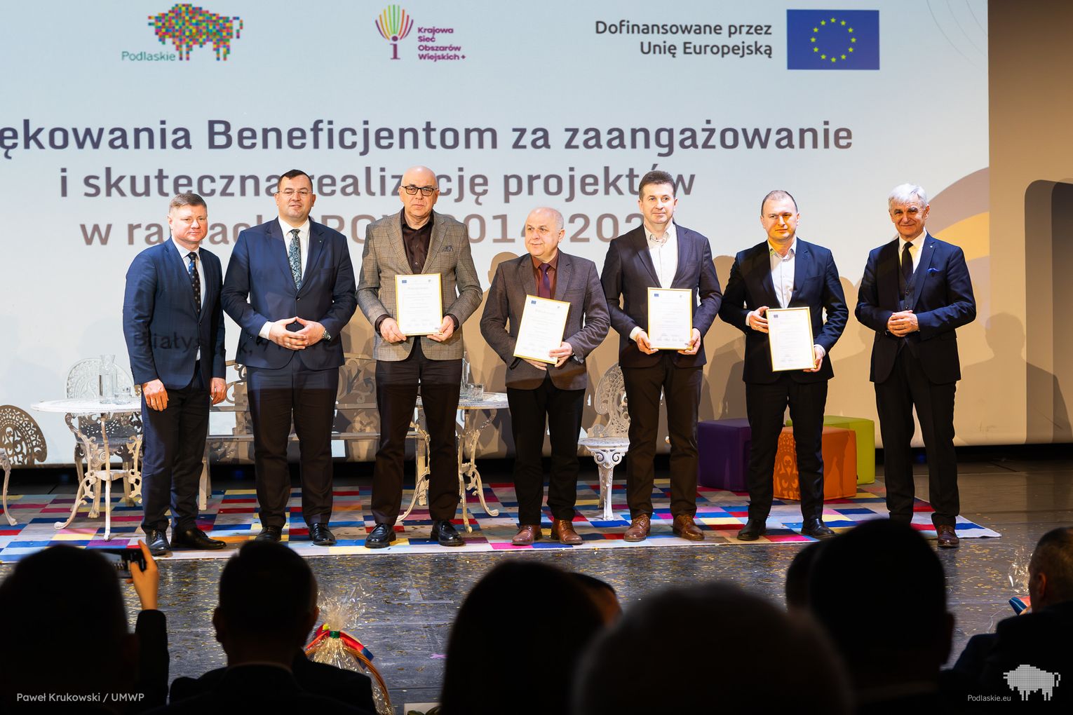 Jednym z kluczowych momentów wydarzenia było uhonorowanie osób zaangażowanych we wdrażanie Programu Rozwoju Obszarów Wiejskich na lata 2014–2020 w województwie podlaskim. Podziękowania skierowano do wszystkich, którzy przyczynili się do realizacji programu, w tym m.in. ministra Stefana Krajewskiego. Podczas uroczystości wręczono także podziękowania beneficjentom programu PROW 2014–2020 – łącznie przyznano 85 wyróżnień. Listy gratulacyjne otrzymali również pracownicy Departamentu Rolnictwa i Rozwoju Obszarów Wiejskich oraz Biura Prawnego Urzędu Marszałkowskiego Województwa Podlaskiego. Był to moment docenienia osób odpowiedzialnych na co dzień za obsługę wniosków, kontakt z beneficjentami oraz zapewnienie wsparcia prawnego – wyróżniono w ten sposób 25 osób. Dodatkowo podczas wydarzenia wręczono 16 odznaczeń Zasłużony dla Rolnictwa osobom szczególnie zaangażowanym w rozwój rolnictwa i obszarów wiejskich. Doceniono także Lokalne Grupy Działania, którym przyznano pamiątkowe grawertony za skuteczne wdrażanie inicjatyw w ramach podejścia LEADER. Pełna lista wyróżnionych znajduje się w załączniku pod artykułem.