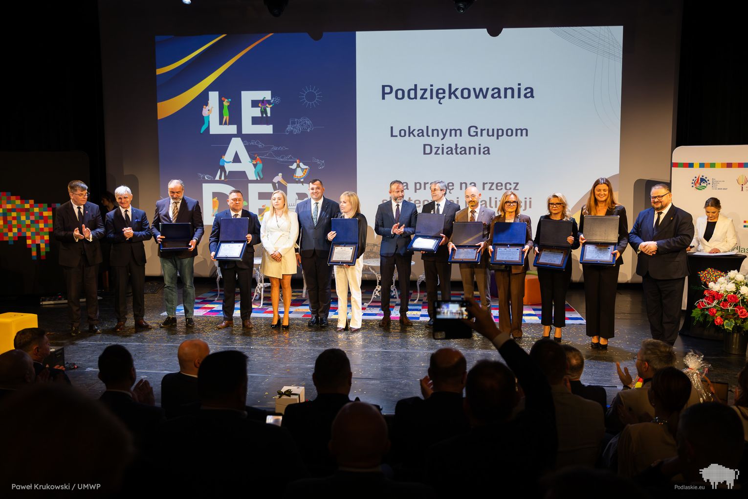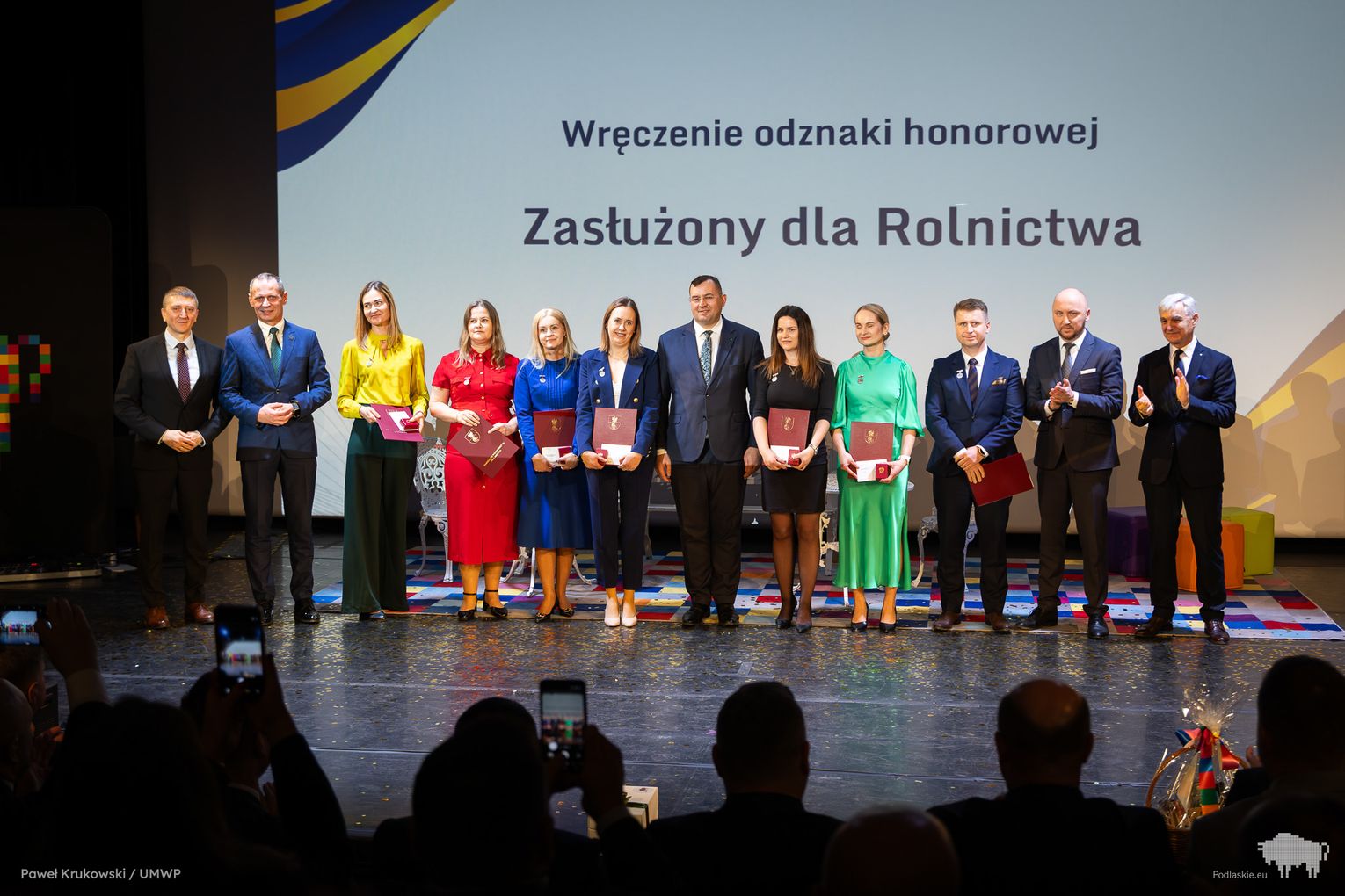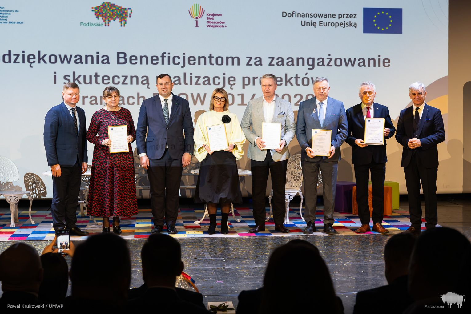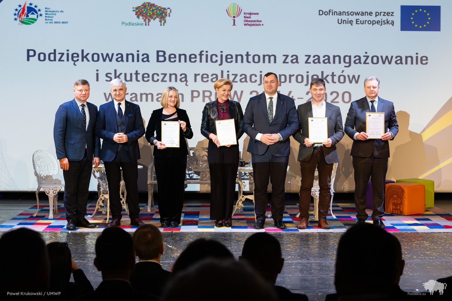 Jednym z kluczowych momentów wydarzenia było uhonorowanie osób zaangażowanych we wdrażanie Programu Rozwoju Obszarów Wiejskich na lata 2014–2020 w województwie podlaskim. Podziękowania skierowano do wszystkich, którzy przyczynili się do realizacji programu, w tym m.in. ministra Stefana Krajewskiego. Podczas uroczystości wręczono także podziękowania beneficjentom programu PROW 2014–2020 – łącznie przyznano 85 wyróżnień. Listy gratulacyjne otrzymali również pracownicy Departamentu Rolnictwa i Rozwoju Obszarów Wiejskich oraz Biura Prawnego Urzędu Marszałkowskiego Województwa Podlaskiego. Był to moment docenienia osób odpowiedzialnych na co dzień za obsługę wniosków, kontakt z beneficjentami oraz zapewnienie wsparcia prawnego – wyróżniono w ten sposób 25 osób. Dodatkowo podczas wydarzenia wręczono 16 odznaczeń Zasłużony dla Rolnictwa osobom szczególnie zaangażowanym w rozwój rolnictwa i obszarów wiejskich. Doceniono także Lokalne Grupy Działania, którym przyznano pamiątkowe grawertony za skuteczne wdrażanie inicjatyw w ramach podejścia LEADER. Pełna lista wyróżnionych znajduje się w załączniku pod artykułem.