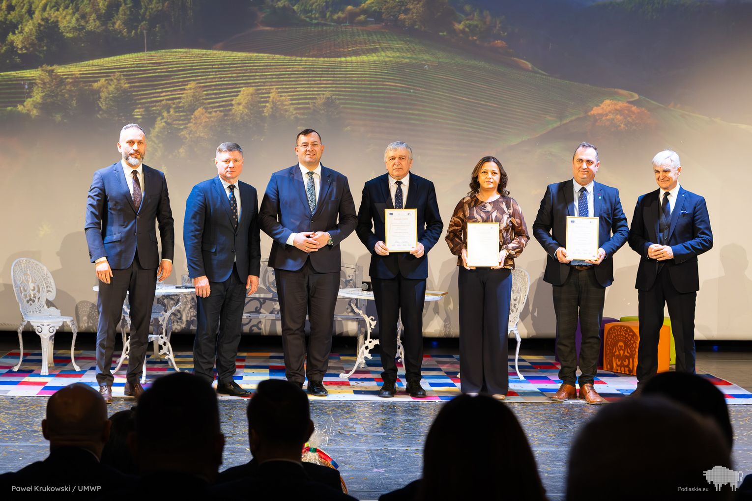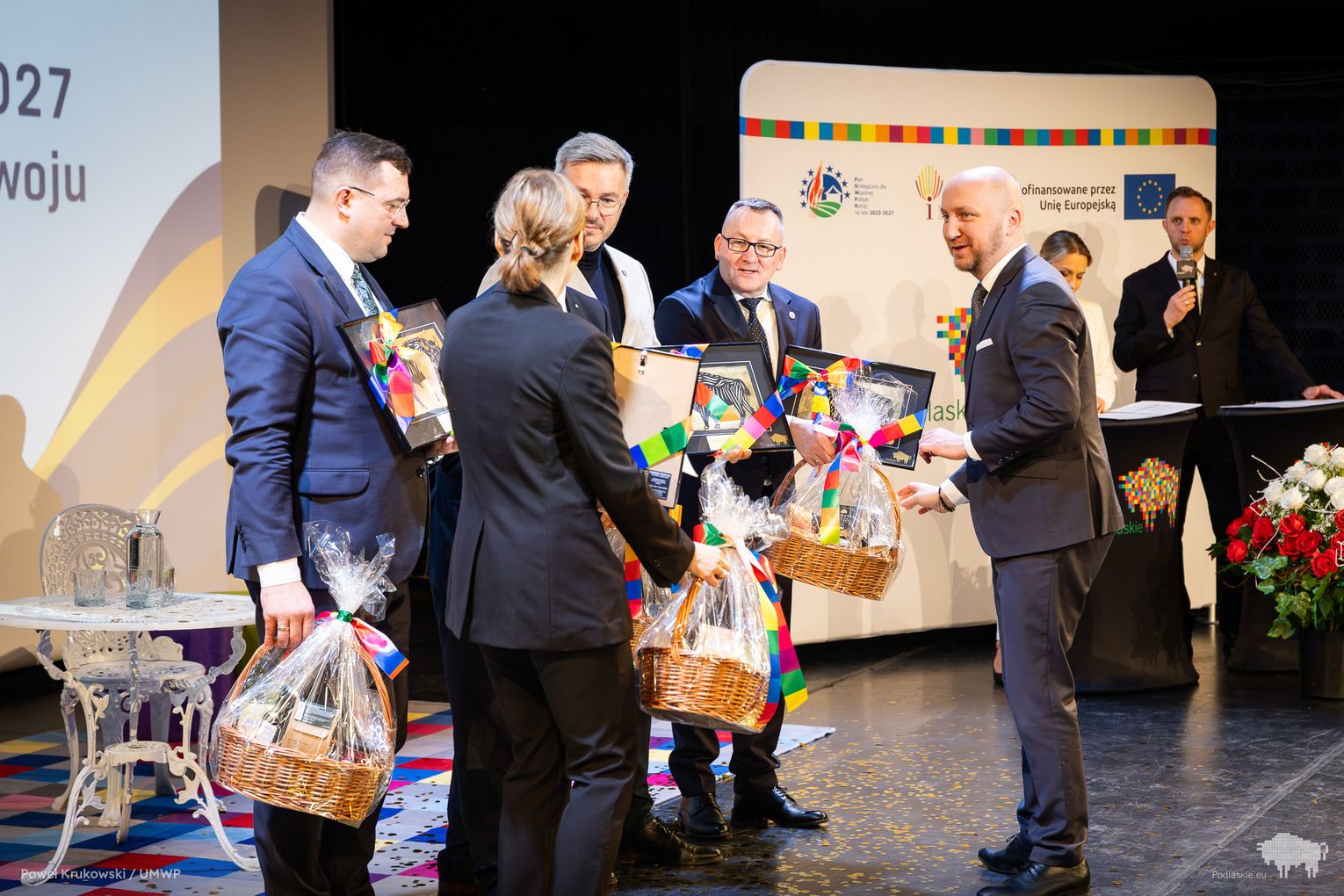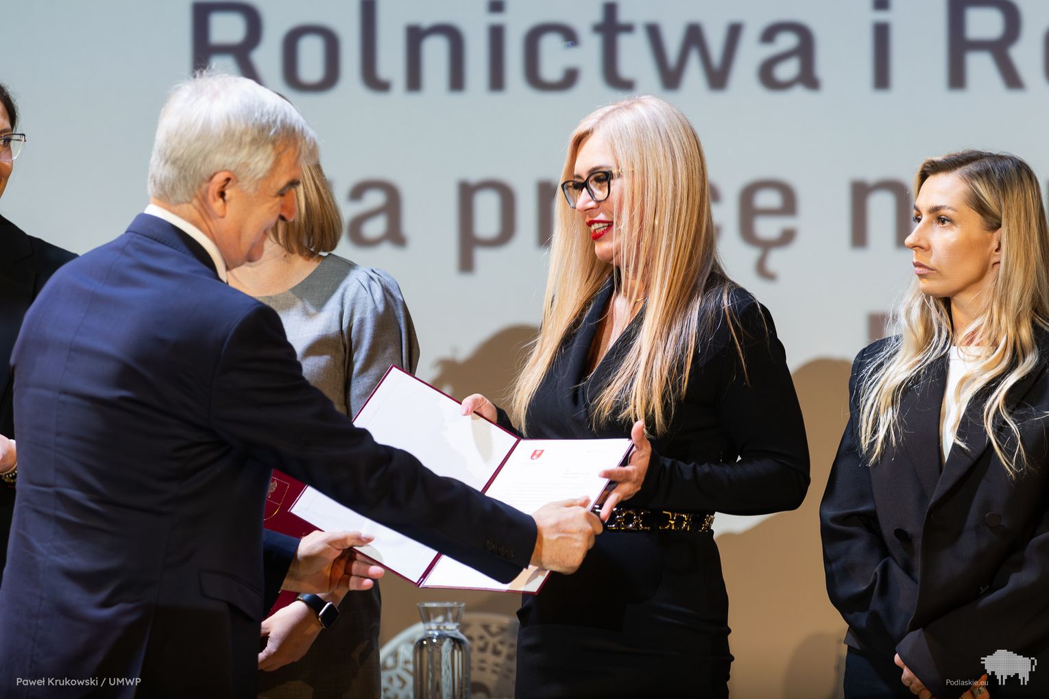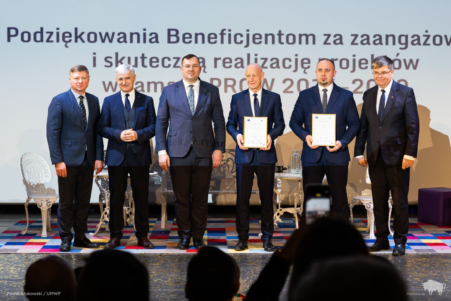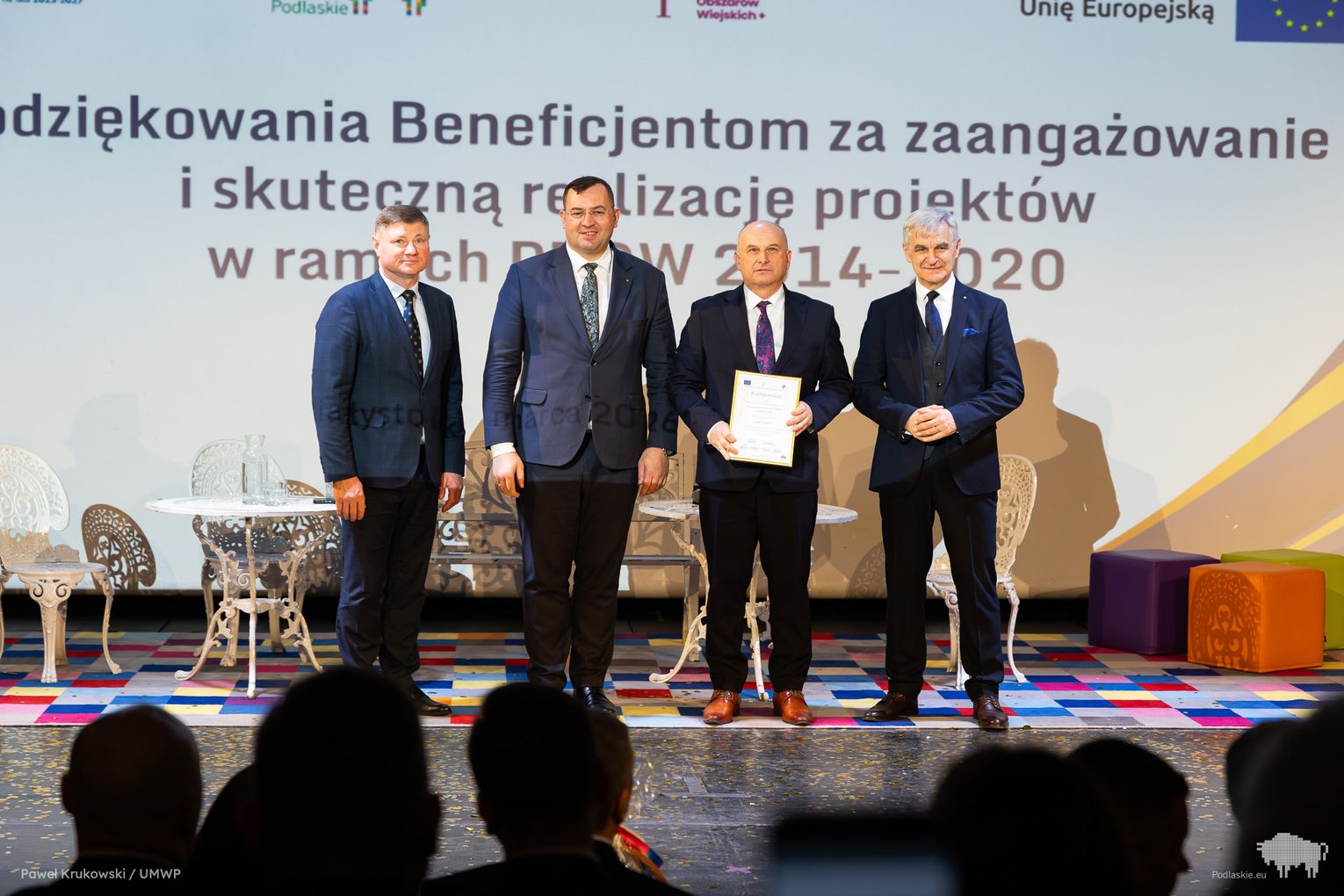 Jednym z kluczowych momentów wydarzenia było uhonorowanie osób zaangażowanych we wdrażanie Programu Rozwoju Obszarów Wiejskich na lata 2014–2020 w województwie podlaskim. Podziękowania skierowano do wszystkich, którzy przyczynili się do realizacji programu, w tym m.in. ministra Stefana Krajewskiego. Podczas uroczystości wręczono także podziękowania beneficjentom programu PROW 2014–2020 – łącznie przyznano 85 wyróżnień. Listy gratulacyjne otrzymali również pracownicy Departamentu Rolnictwa i Rozwoju Obszarów Wiejskich oraz Biura Prawnego Urzędu Marszałkowskiego Województwa Podlaskiego. Był to moment docenienia osób odpowiedzialnych na co dzień za obsługę wniosków, kontakt z beneficjentami oraz zapewnienie wsparcia prawnego – wyróżniono w ten sposób 25 osób. Dodatkowo podczas wydarzenia wręczono 16 odznaczeń Zasłużony dla Rolnictwa osobom szczególnie zaangażowanym w rozwój rolnictwa i obszarów wiejskich. Doceniono także Lokalne Grupy Działania, którym przyznano pamiątkowe grawertony za skuteczne wdrażanie inicjatyw w ramach podejścia LEADER. Pełna lista wyróżnionych znajduje się w załączniku pod artykułem.