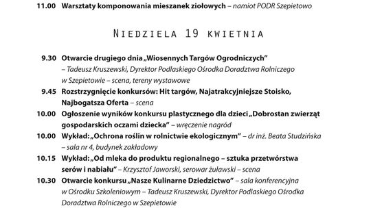 W sobotę o godzinie 10.00 nastąpi uroczyste otwarcie targów oraz wystawy królików rasowych. Odwiedzający będą mogli wziąć udział w wydarzeniach edukacyjnych i warsztatowych. Zaplanowano m.in.: konkurs wiedzy o roślinach „Zgadnij co to za roślina”, warsztaty komponowania mieszanek ziołowych i otwarcie nowo wybudowanej sali konferencyjnej w Ośrodku Szkoleniowym.